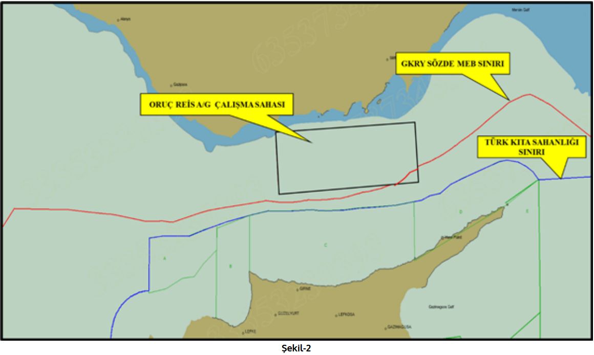 Οι περιοχές που καθορίζονται στις τρέχουσες δραστηριότητες έρευνας και γεώτρησης καθορίζονται σύμφωνα με τις επιστημονικές, τεχνικές απαιτήσεις και ανάγκες, σύμφωνα με την υφαλοκρηπίδα μας (Εικόνα-1), η οποία καθορίστηκε από τη Συμφωνία Υφαλοκρηπίδας που υπογράψαμε με την ΤΔΒΚ το 2011 και των οποίων τα σύνορα κοινοποιήθηκαν στον ΟΗΕ στις 18 Μαρτίου 2020. Σε αυτό το πλαίσιο, η περιοχή που απαιτείται για το σκάφος σεισμικής έρευνας Oruç Reis στα νοτιοδυτικά του κόλπου της Μερσίνας (Εικόνα-2) δημοσιεύτηκε με την ανακοίνωση της NAVTEX.