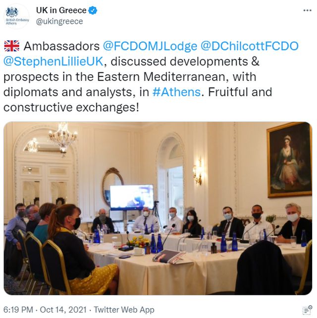 Η διαρροή της συνάντησης όμως ανάγκασε τον νέο Βρετανό πρέσβη, Μάθιου Λοτζ, να την «επικοινωνήσει» μέσω twitter σε εξειδικευμένες σελίδες του διαδικτύου, με φωτογραφία άλλη από των συμμετεχόντων και με αναφορά σε σύνθεση με «διπλωμάτες και ειδικούς αναλυτές».