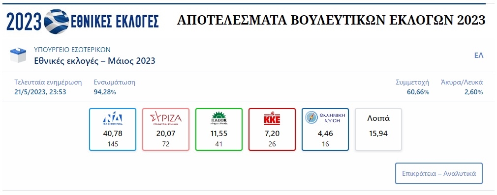 Ισχυρή νίκη σημειώνει στις βουλευτικές εκλογές η Νέα Δημοκρατία, η οποία προηγείται με διαφορά 20,7 μονάδων στο 94,28% της Επικράτειας, καθώς συγκεντρώνει το 40,78% και 145 έδρες, με τον ΣΥΡΙΖΑ να λαμβάνει το 20,07% και 72 έδρες, το ΠΑΣΟΚ-ΚΙΝΑΛ το 11,565% και 41 έδρες, το ΚΚΕ το 7,20% και 26 έδρες και η Ελληνική Λύση το 4,456% και 16 έδρες. Τα λοιπά κόμματα συγκεντρώνουν το 15,94%.